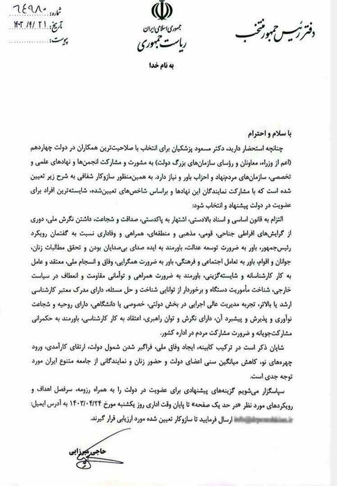 متن کامل نامه به این شرح است: چنانچه استحضار دارید مسعود پزشکیان برای انتخاب با صلاحیت ترین همکاران در دولت چهاردهم اعم از وزراء معاونان و رؤسای سازمانهای بزرگ دولت به مشورت و مشارکت انجمن ها و نهادهای علمی و تخصصی سازمانهای مردم نهاد و احزاب باور و نیاز دارد به همین منظور سازوکار شفافی به شرح زیر تعیین شده است که با مشارکت نمایندگان این نهادها و بر اساس شاخصهای تعیین شده شایسته ترین افراد برای عضویت در دولت پیشنهاد و انتخاب شود.