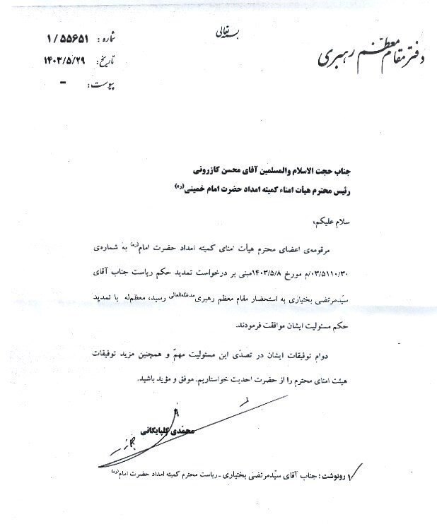 در این حکم خطاب به آیتالله محسن کازرونی، رئیس هیات امنای کمیته امداد حضرت امام خمینی(ره) آمده است: «سلام علیکم؛ مرقومه اعضای محترم هیات امنای کمیته امداد حضرت امام(ره) مبنی بر درخواست تمدید حکم ریاست جناب آقای سید مرتضی بختیاری، به استحضار مقام معظم رهبری(مدظله العالی) رسید، معظم له با تمدید حکم مسئولیت ایشان موافقت فرمودند.»